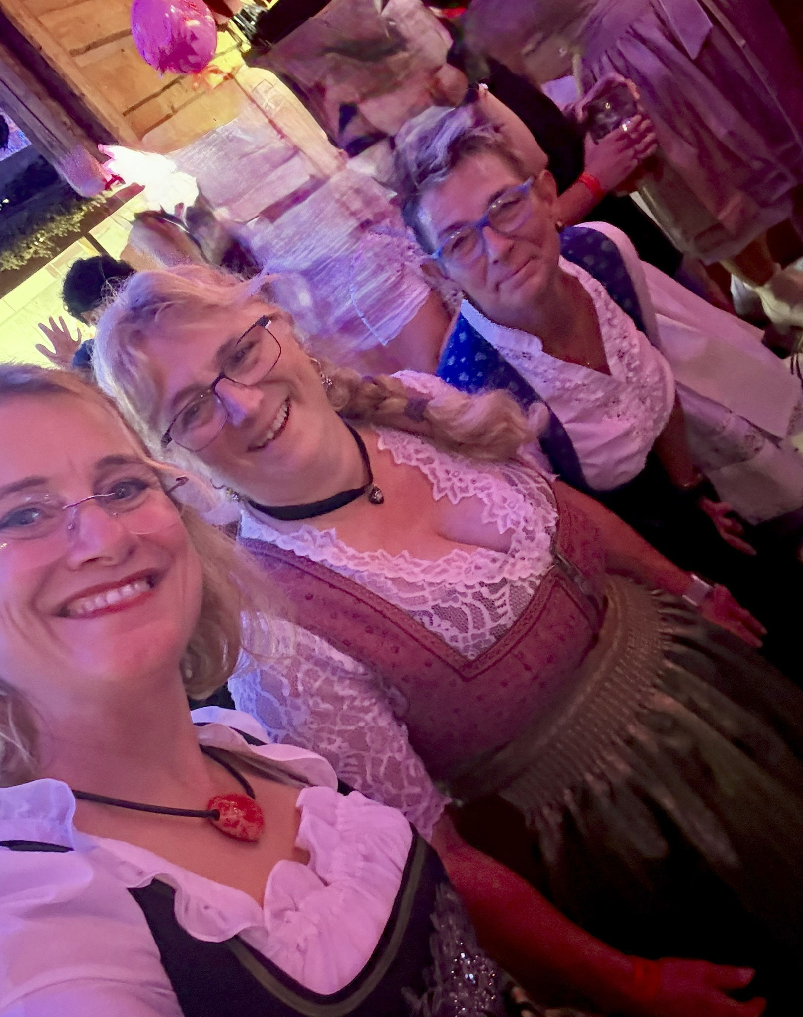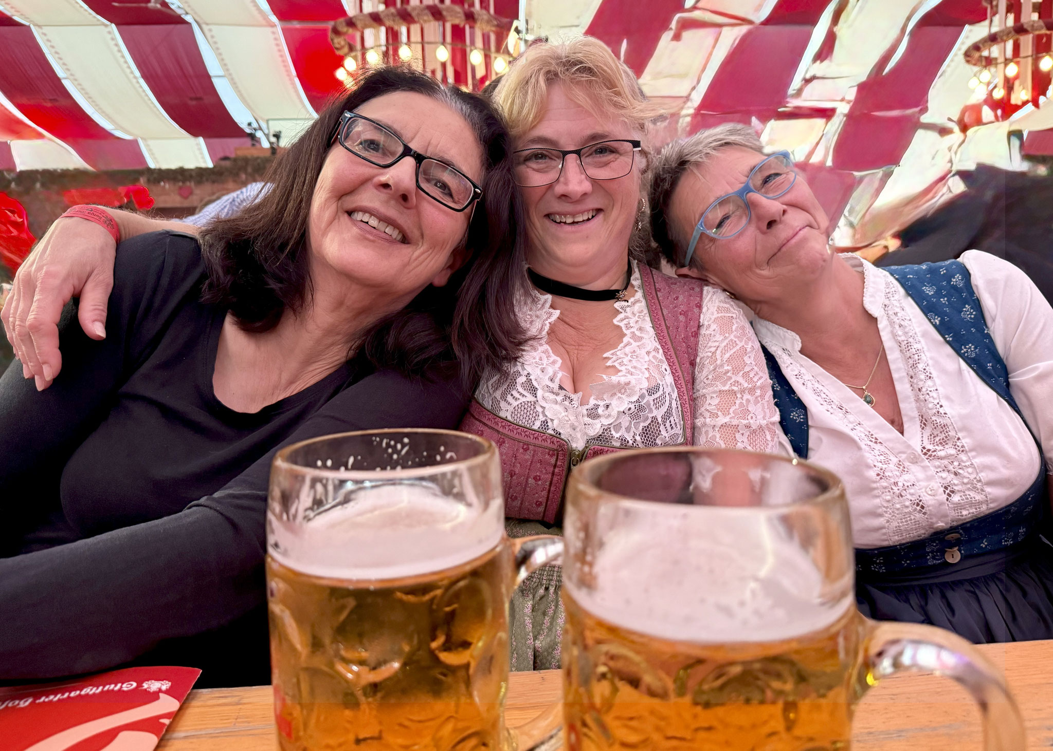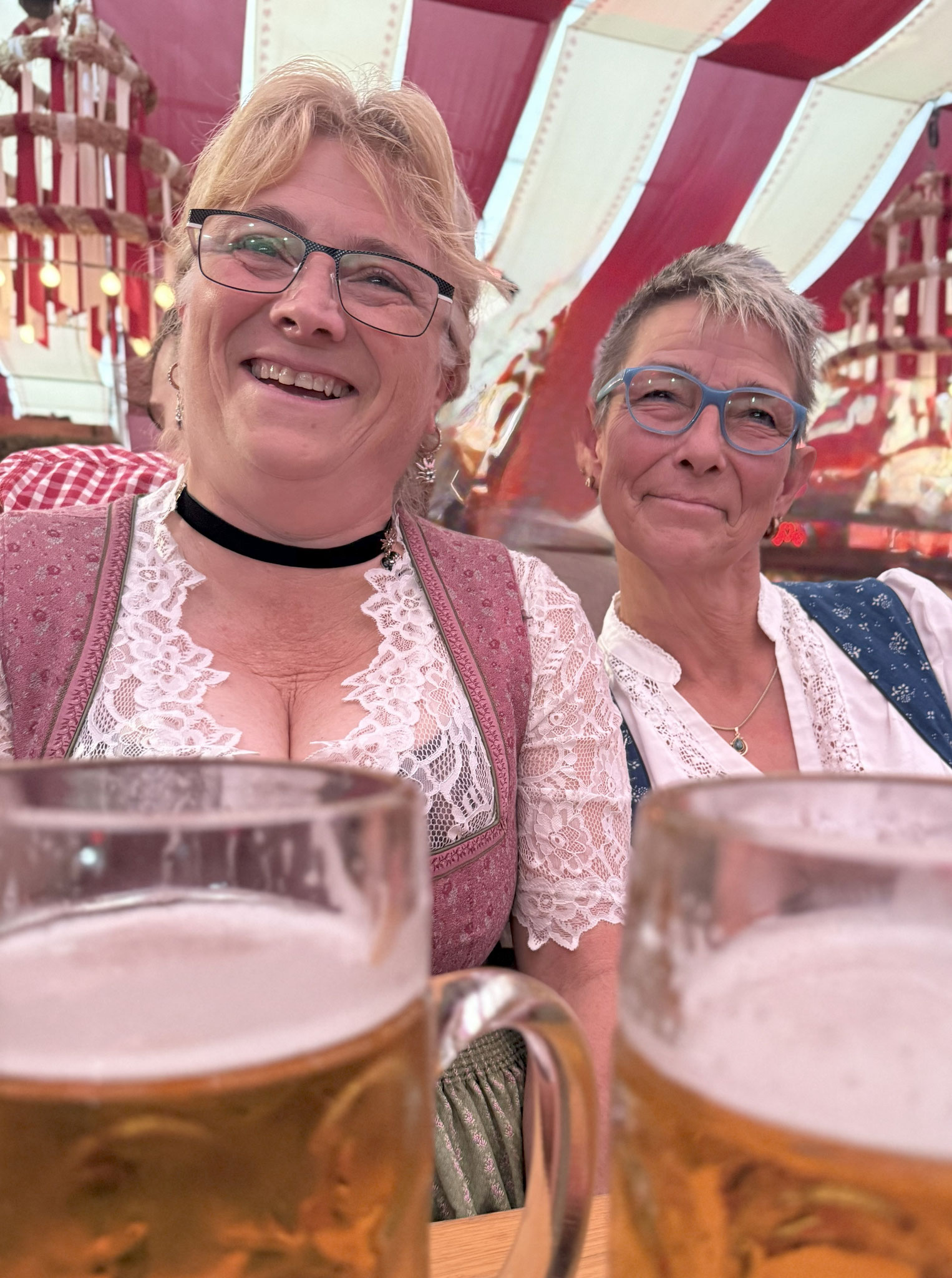 Ein Tisch im Festzelt ist fester Bestandteil unserer Tradition, und dort geht es rund: es wird gesungen, geschunkelt, gelacht und kräftig angestoßen. Natürlich sind wir auch immer fesch angezogen – Dirndl und Lederhose sitzen, die Stimmung passt, und das Maß Bier schmeckt gleich doppelt so gut.